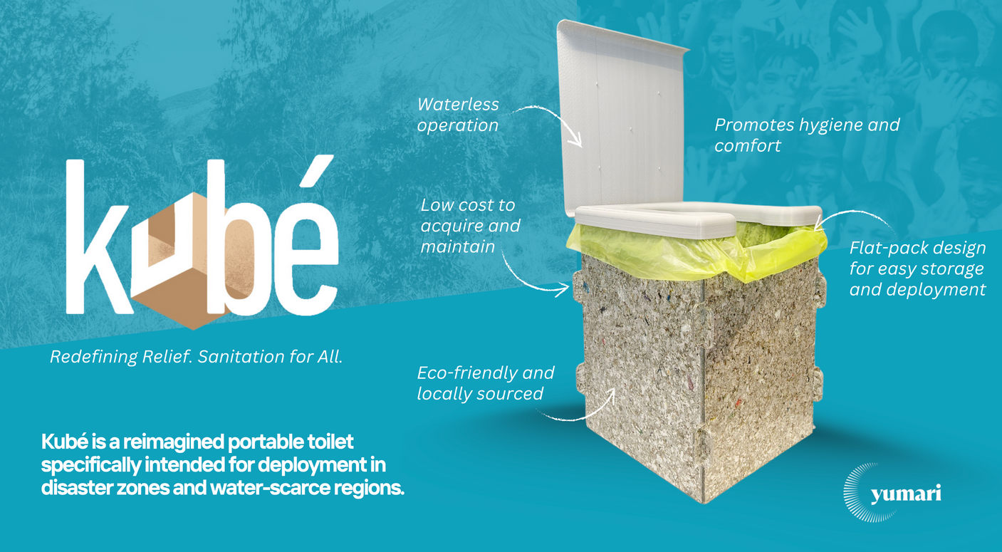 Kubé is a waterless, flatpack, portable toilet designed for deployment as a kit for households in evacuation centers.